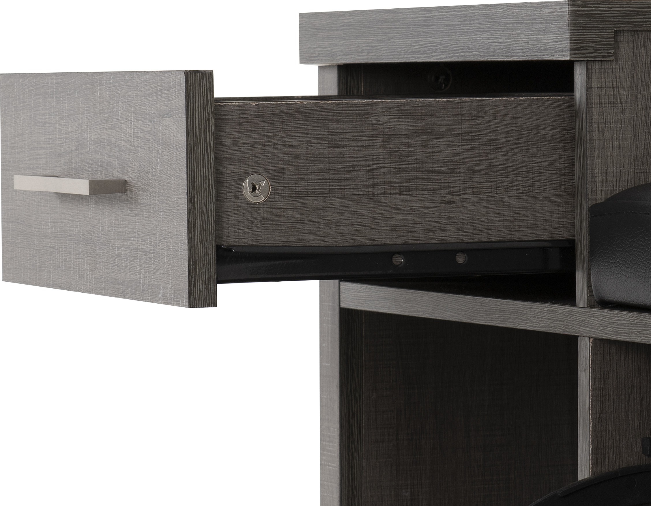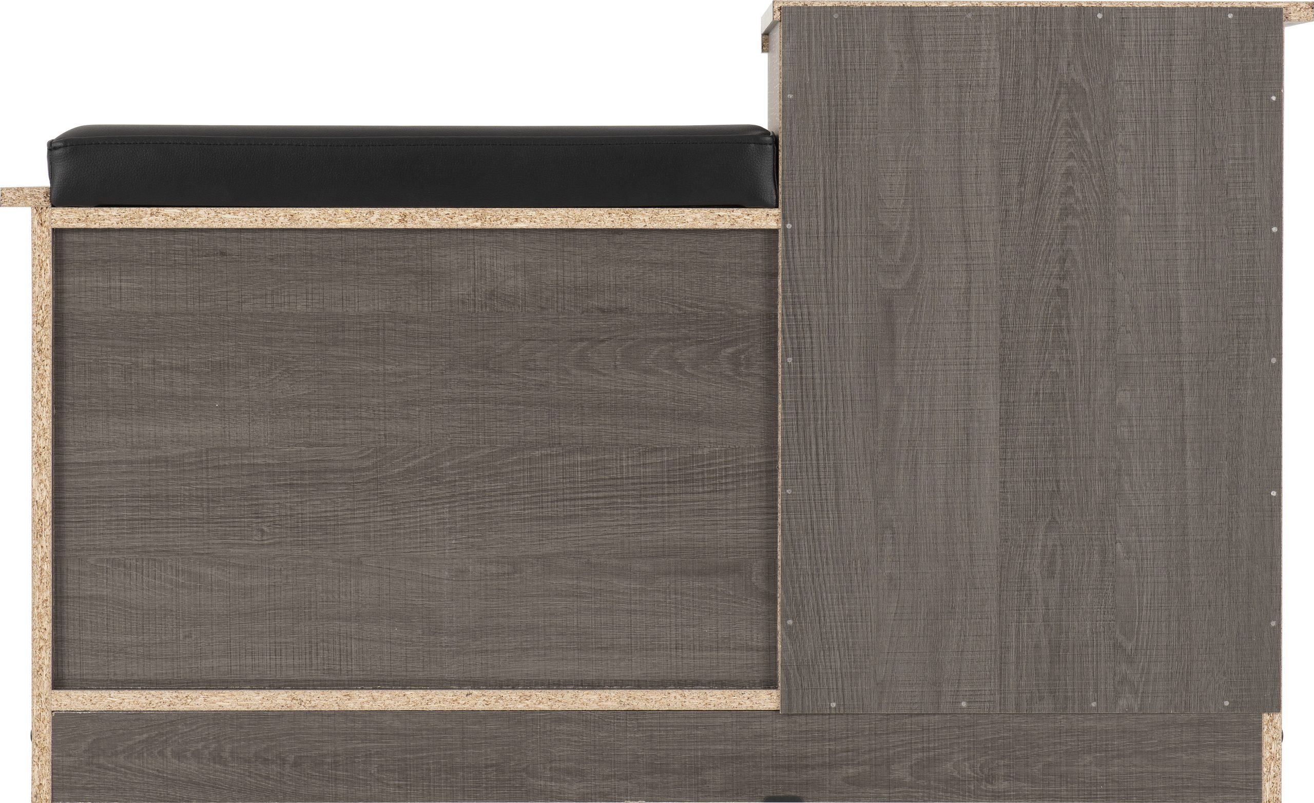 COMPOSITE BOARD, PAPER VENEER, PLASTIC VENEER, MDF BACK PANEL, MDF DRAWER BASE, METAL HANDLE, METAL DRAWER RUNNERS, FAUX LEATHER, FOAM, PLASTIC FEET