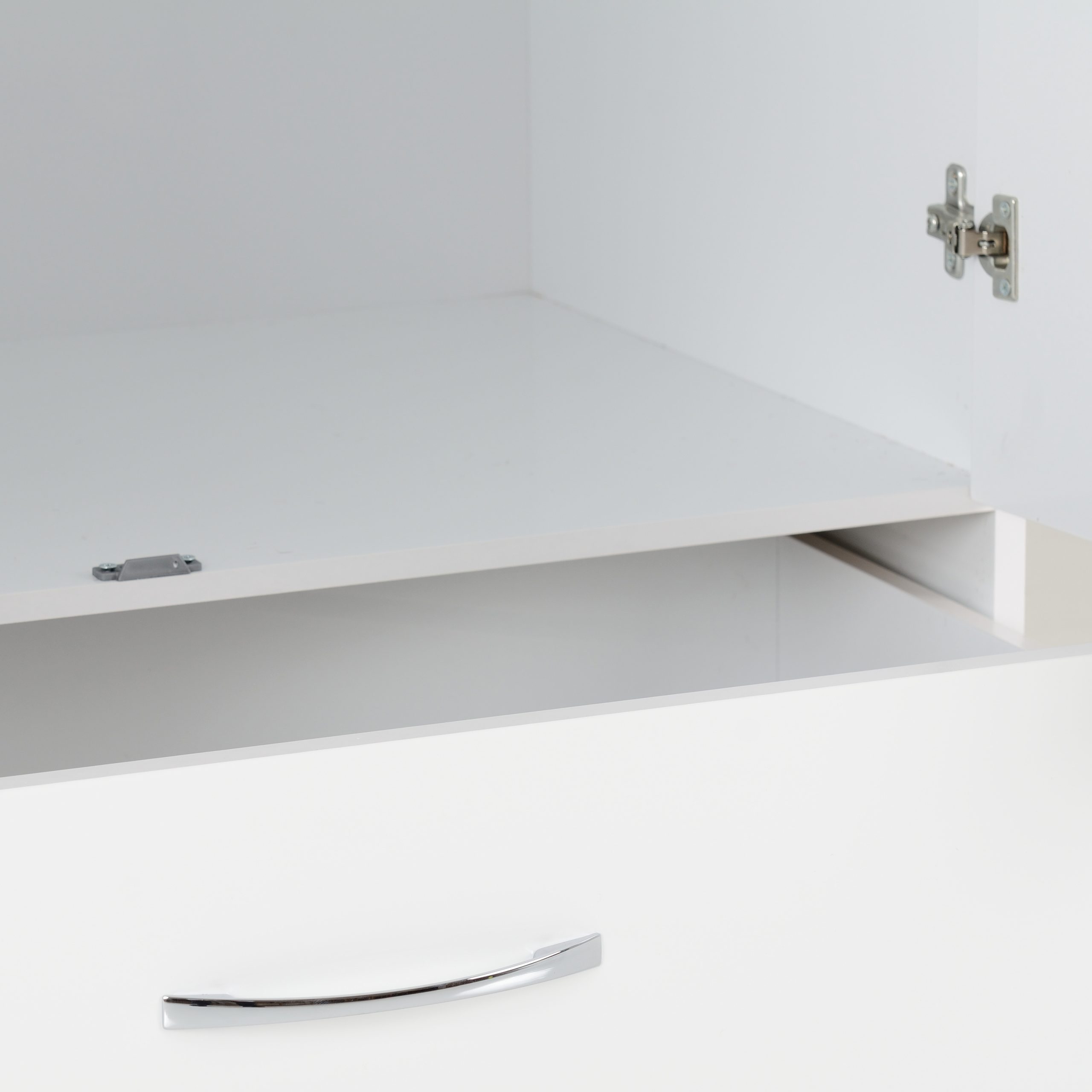 COMPOSITE BOARD, PLASTIC VENEER, MDF BACK PANEL, MDF DRAWER BASE, METAL HANDLE, METAL HINGES, METAL DRAWER RUNNERS, METAL HANGING RAIL, PLASTIC FEET
